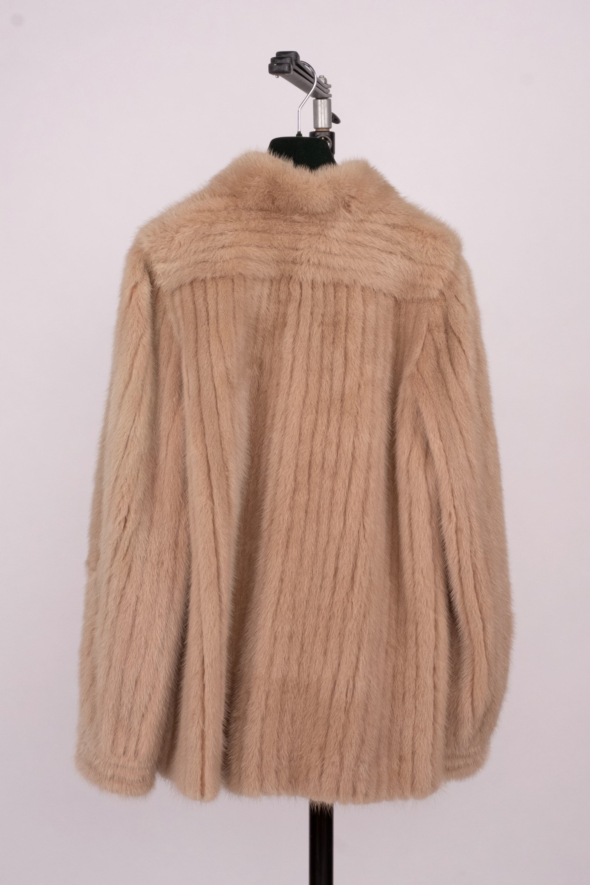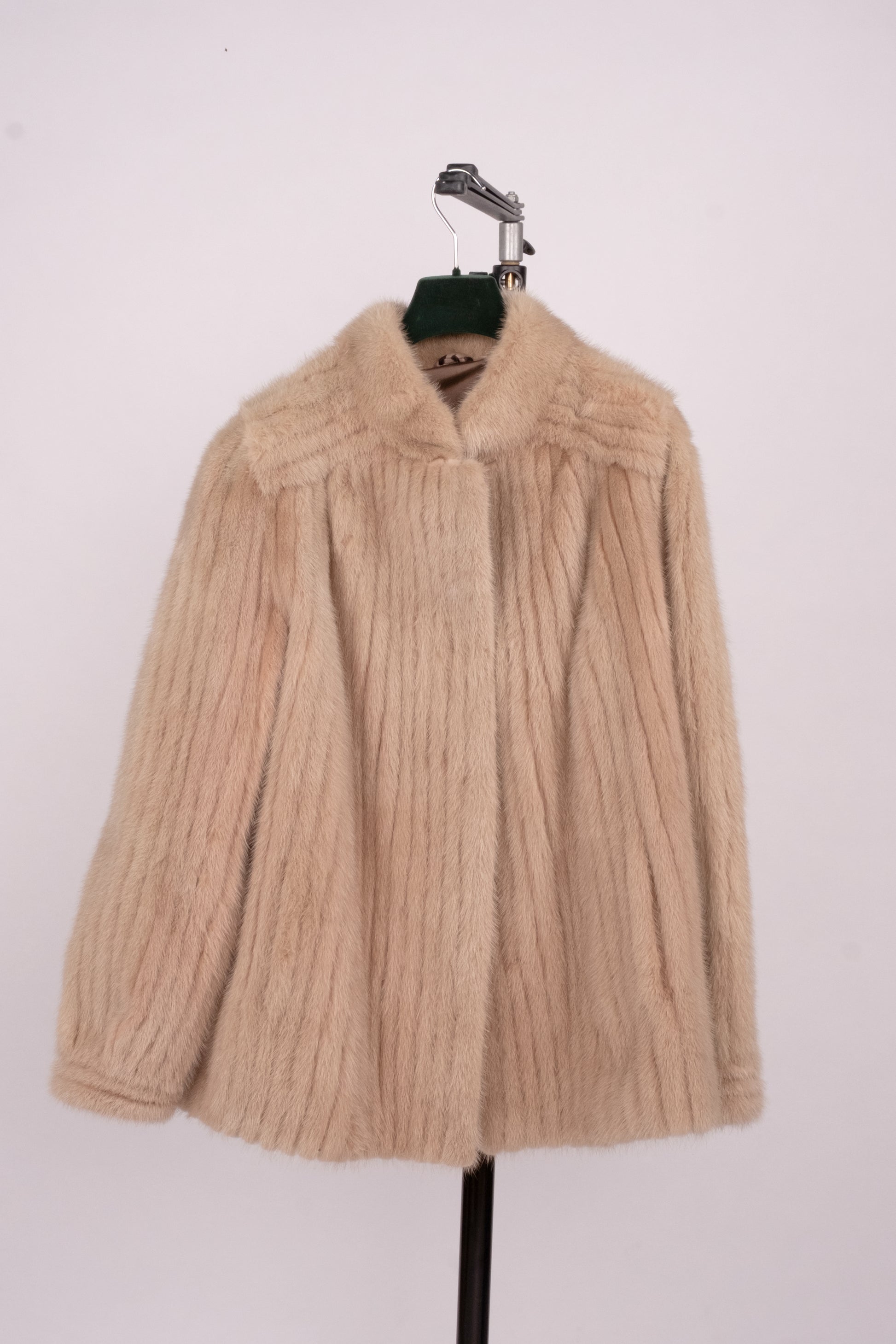 Diese Vintage-Pelzjacke strahlt leise Eleganz aus. Ihr cremebeiges Nerzfell verläuft in feinen, senkrechten Linien, die ihr eine anmutige Struktur und zeitlose Ausstrahlung verleihen. Der warme, helle Farbton schmeichelt jedem Teint und vermittelt ein Gefühl von ruhigem, unaufdringlichem Luxus.