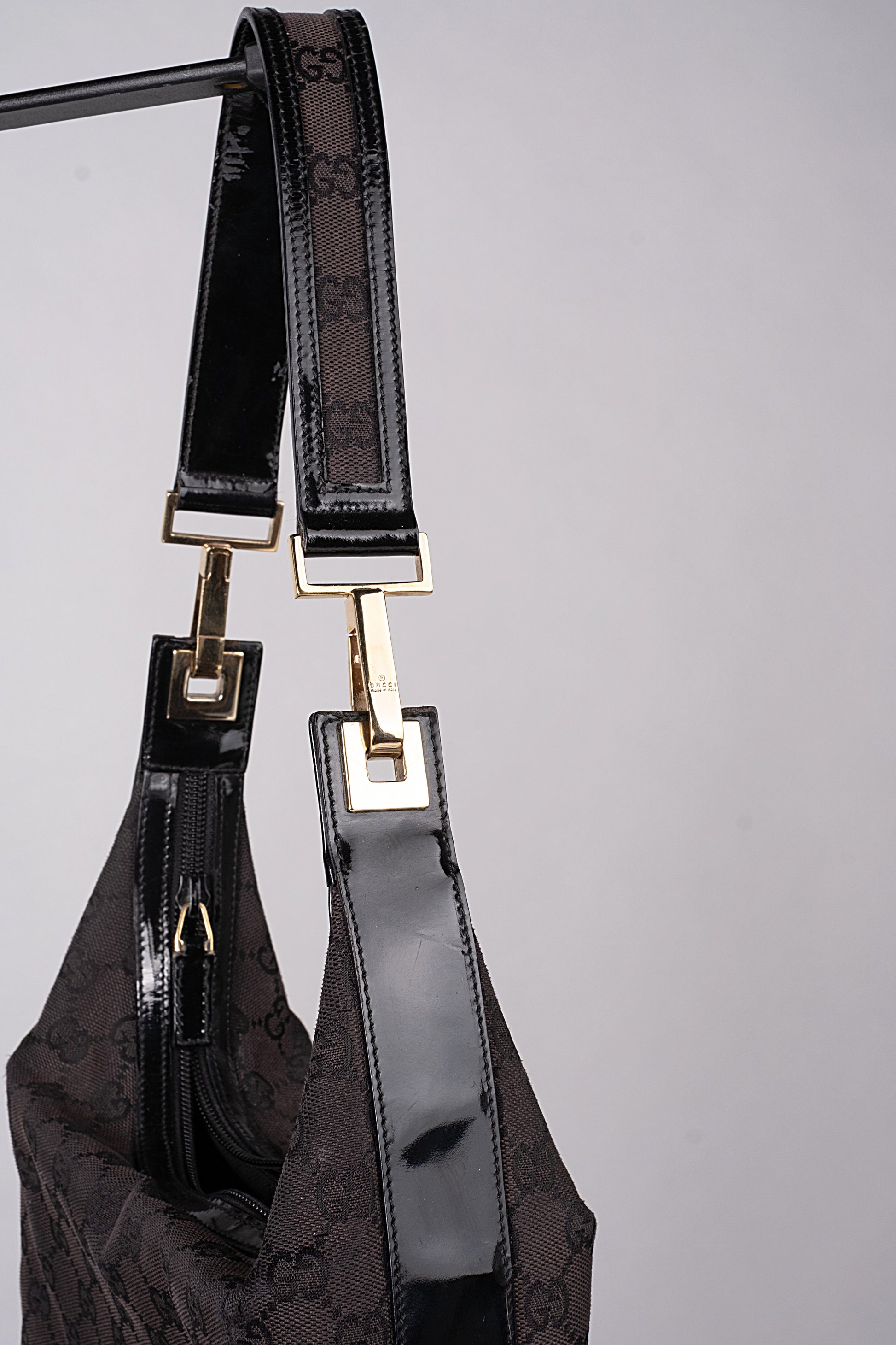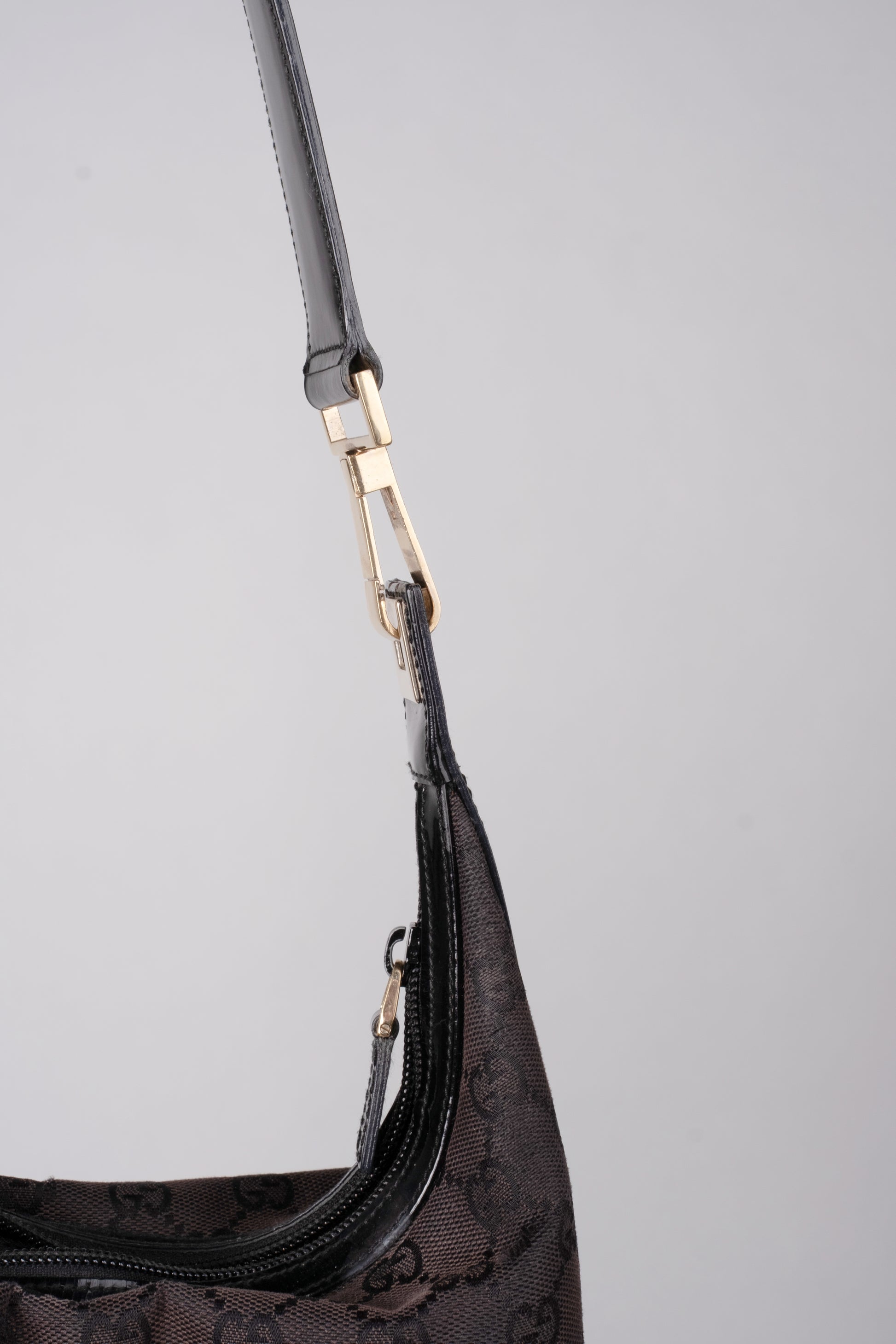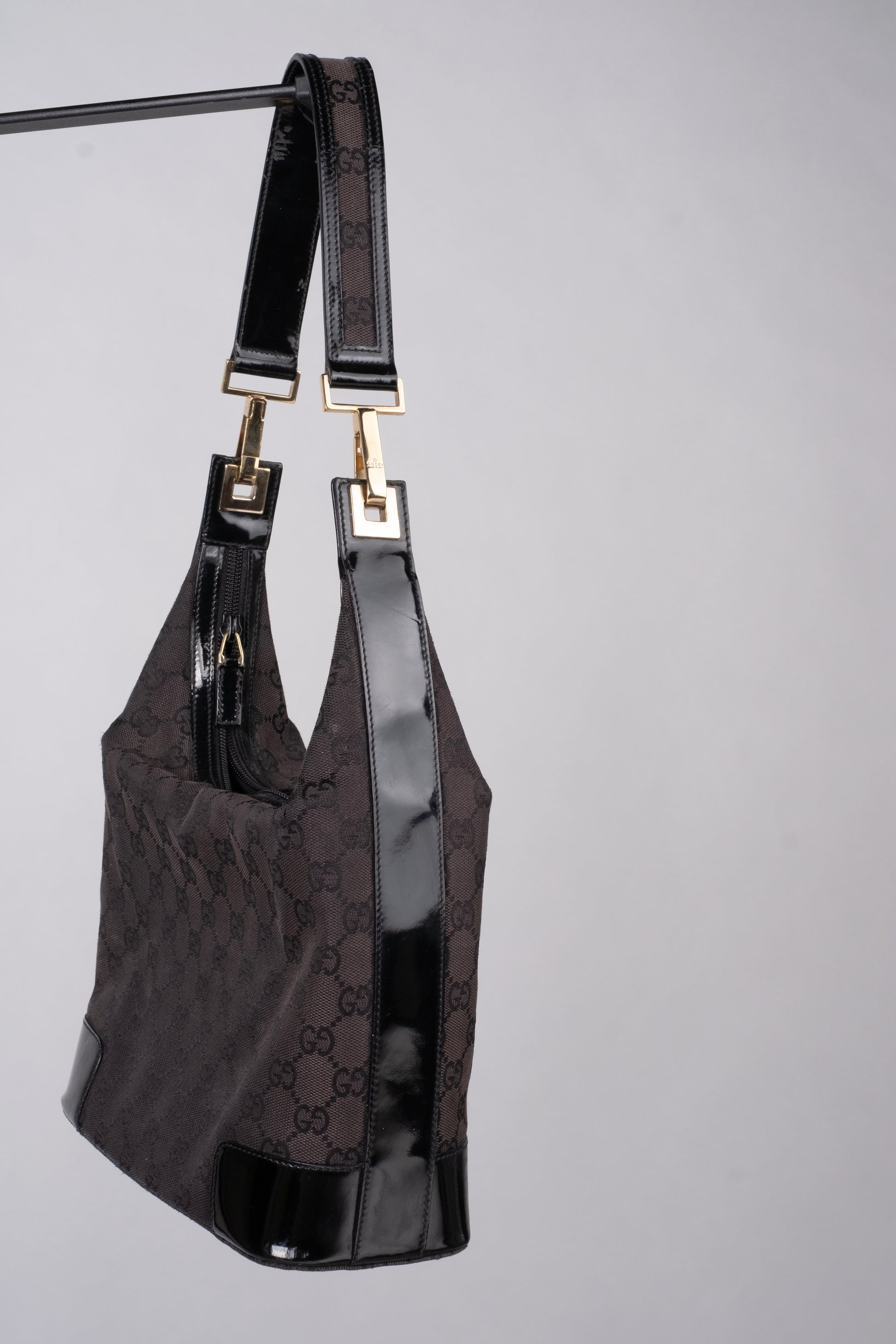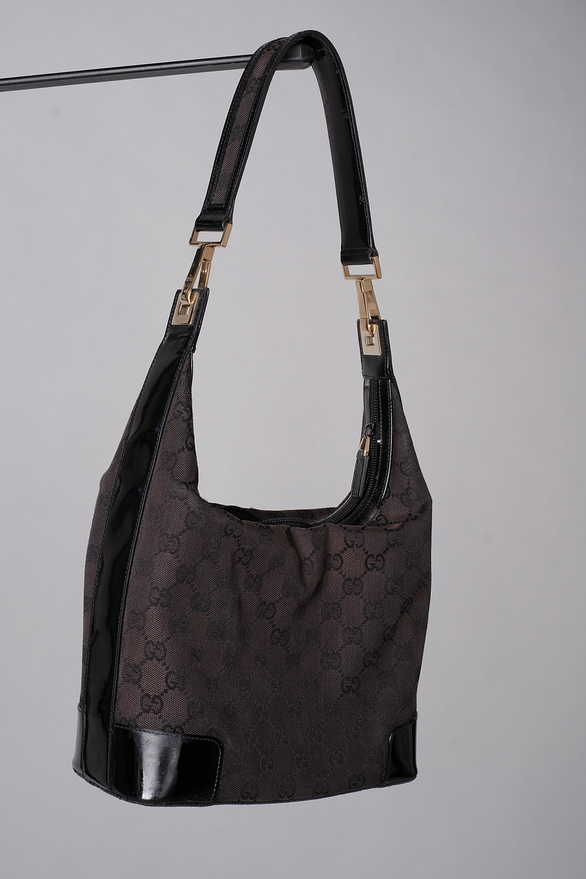 A vintage Gucci shoulder bag crafted from the house’s signature logo canvas, accented with patent leather straps detailed with a canvas stripe inlay — a genuine statement piece from Gucci’s golden era.