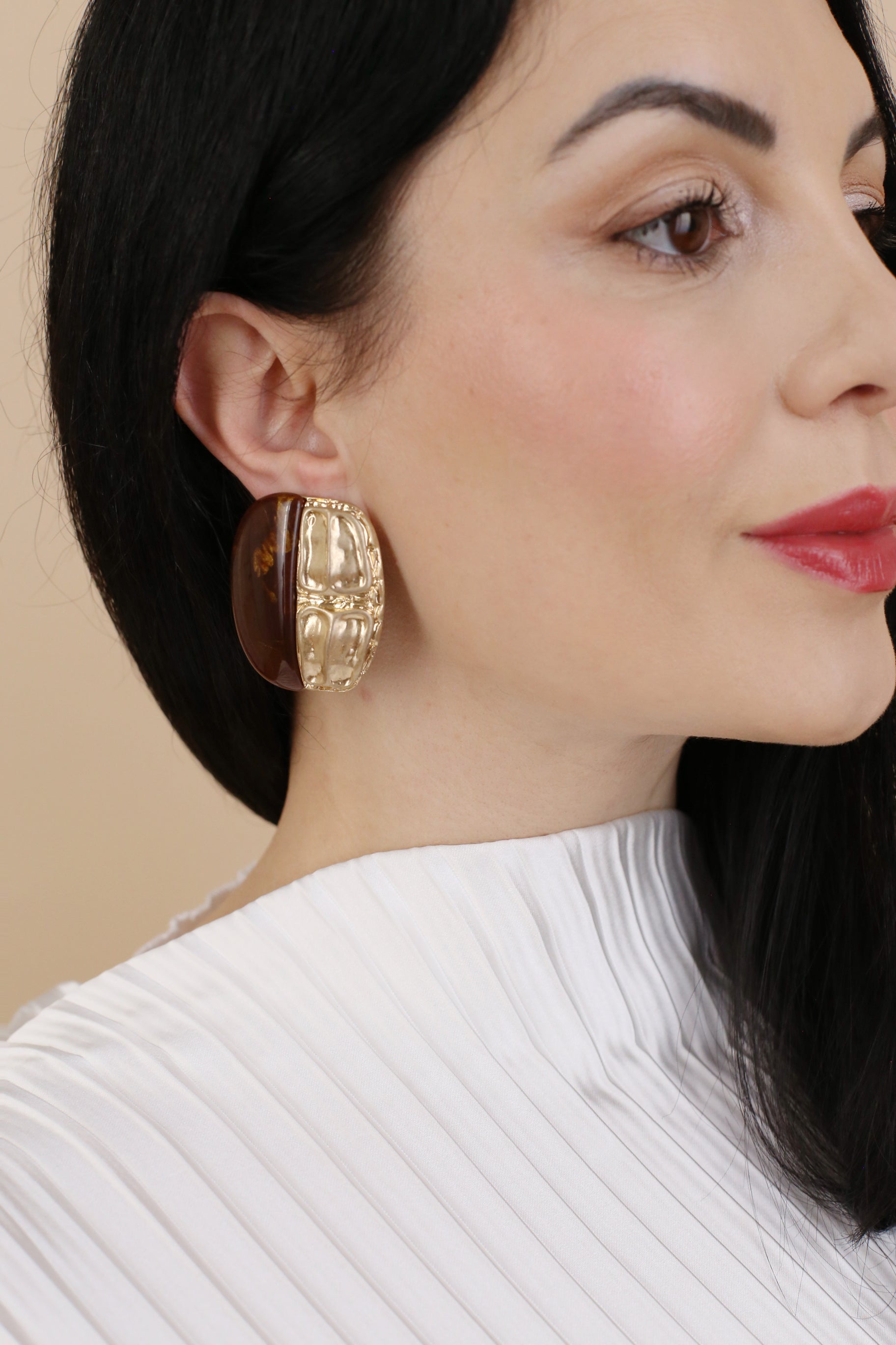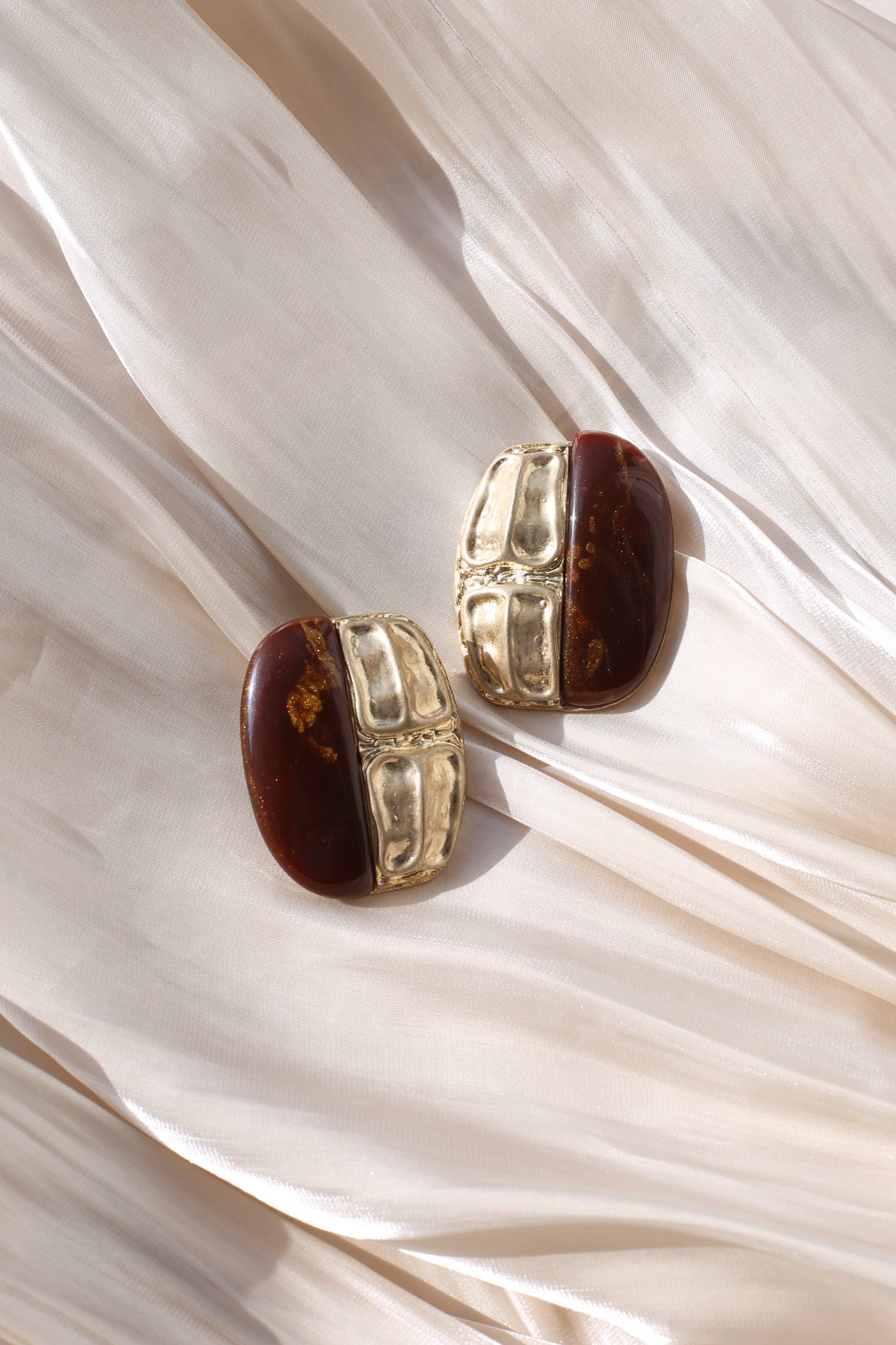 Liora is a bold vintage statement with warm, earthy elegance. These clip-ons feature a sculptural half-moon amber resin (with beautiful marbled depth) paired with a textured gold-tone panel for a striking two-part design. The perfect piece to elevate neutral looks, linen sets, and chocolate-brown tones—effortlessly chic, day to night.