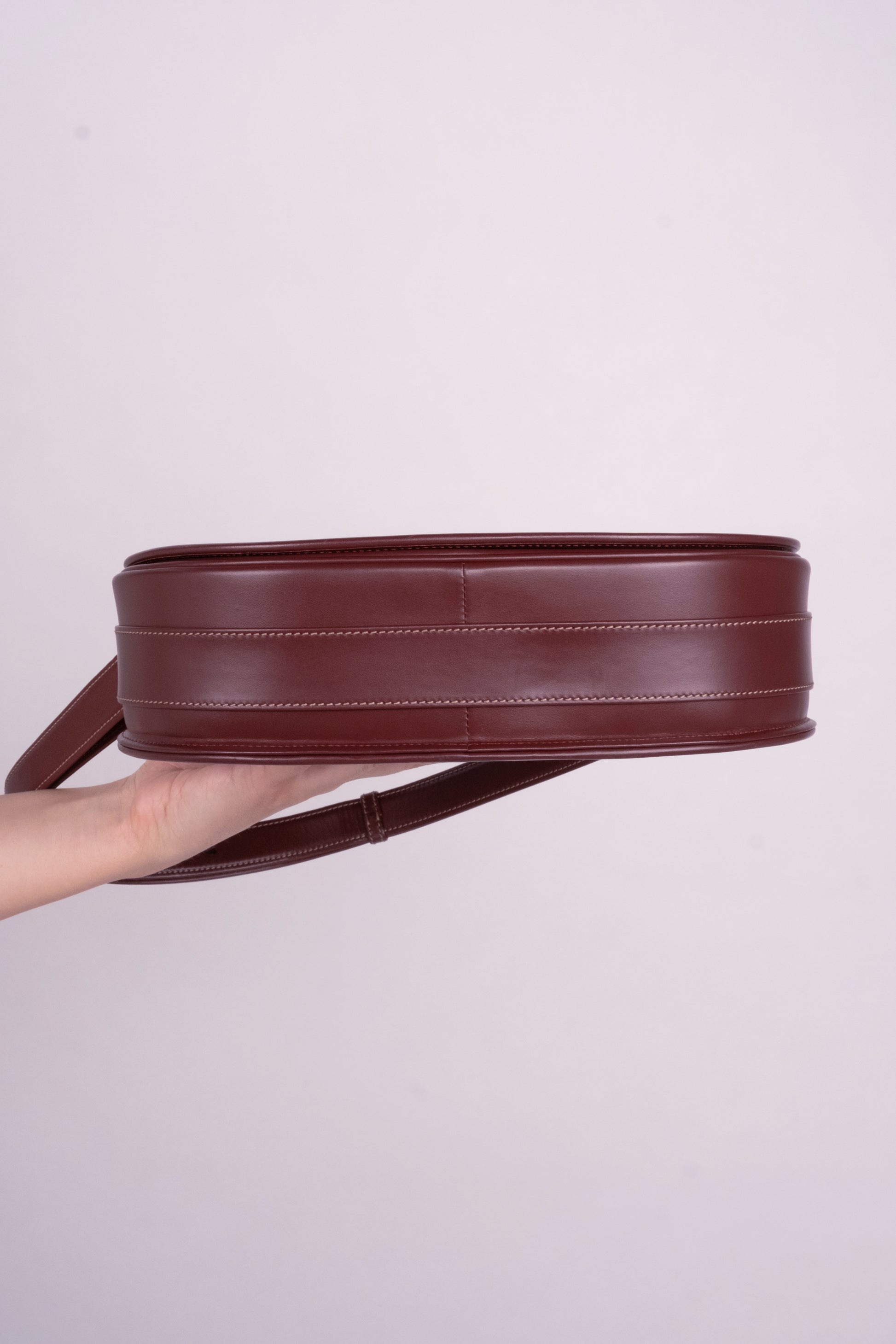 In Cartier’s signature deep Bordeaux red, this vintage Must de Cartier Paris bag captures timeless elegance with its saddle bag silhouette and refined gold buckle. The adjustable strap allows it to be worn crossbody by day and shortened into a chic shoulder bag by night — effortlessly versatile, unmistakably sophisticated.