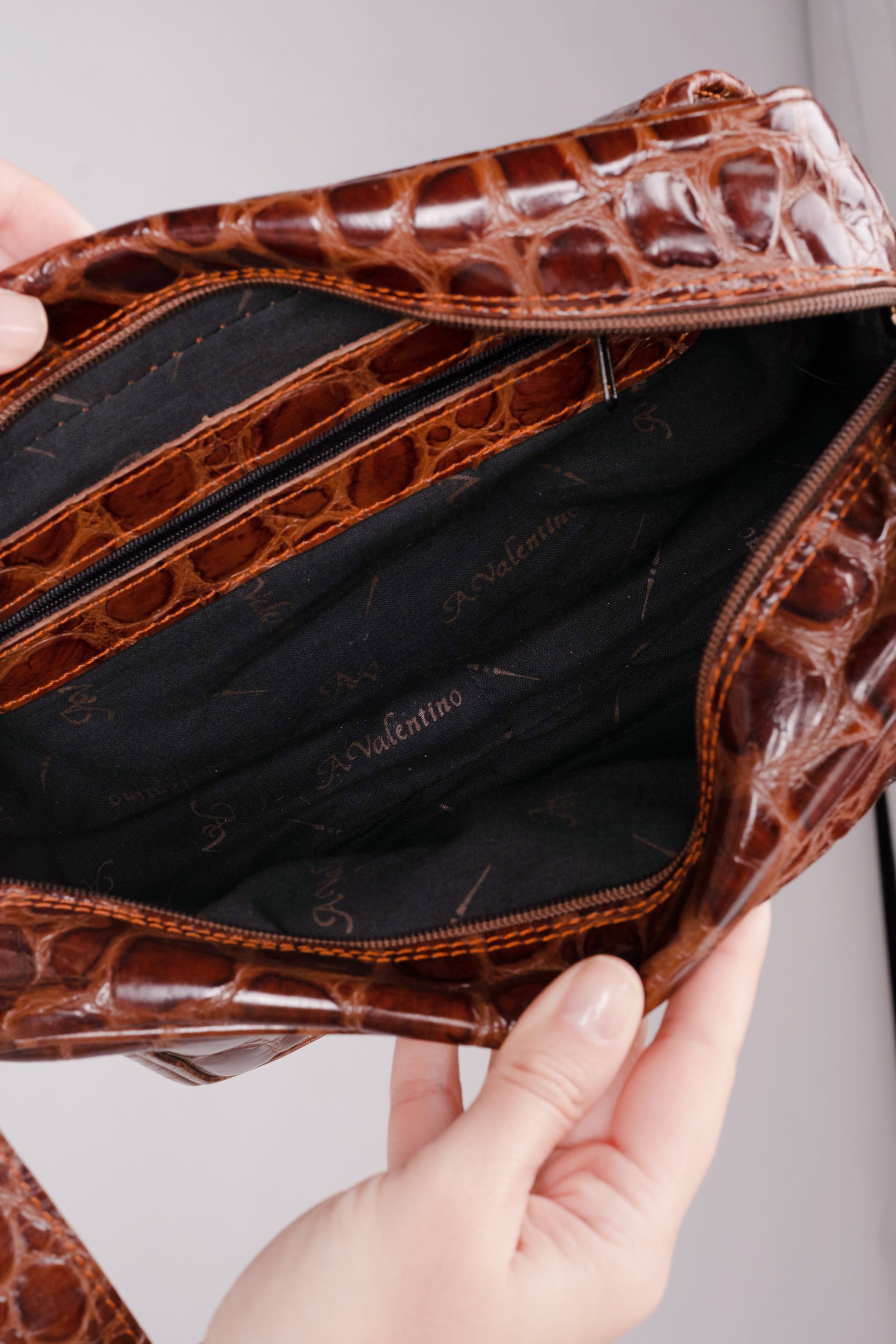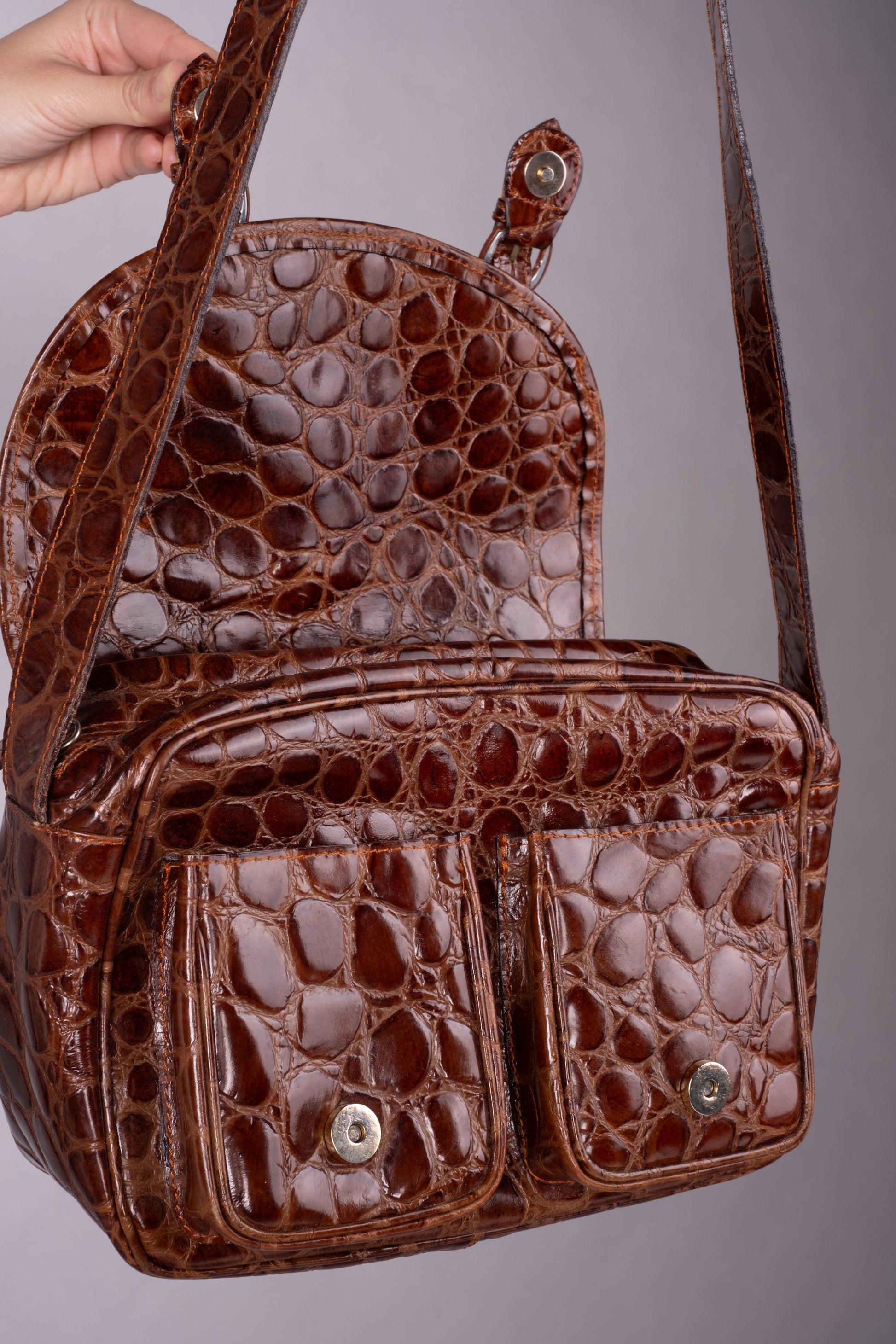 A stunning 1970s shoulder bag crafted from cognac-brown alligator leather — a true vintage treasure preserved in excellent condition. The rich patina of the leather highlights its natural texture, while the two front pockets add both functionality and charm.
