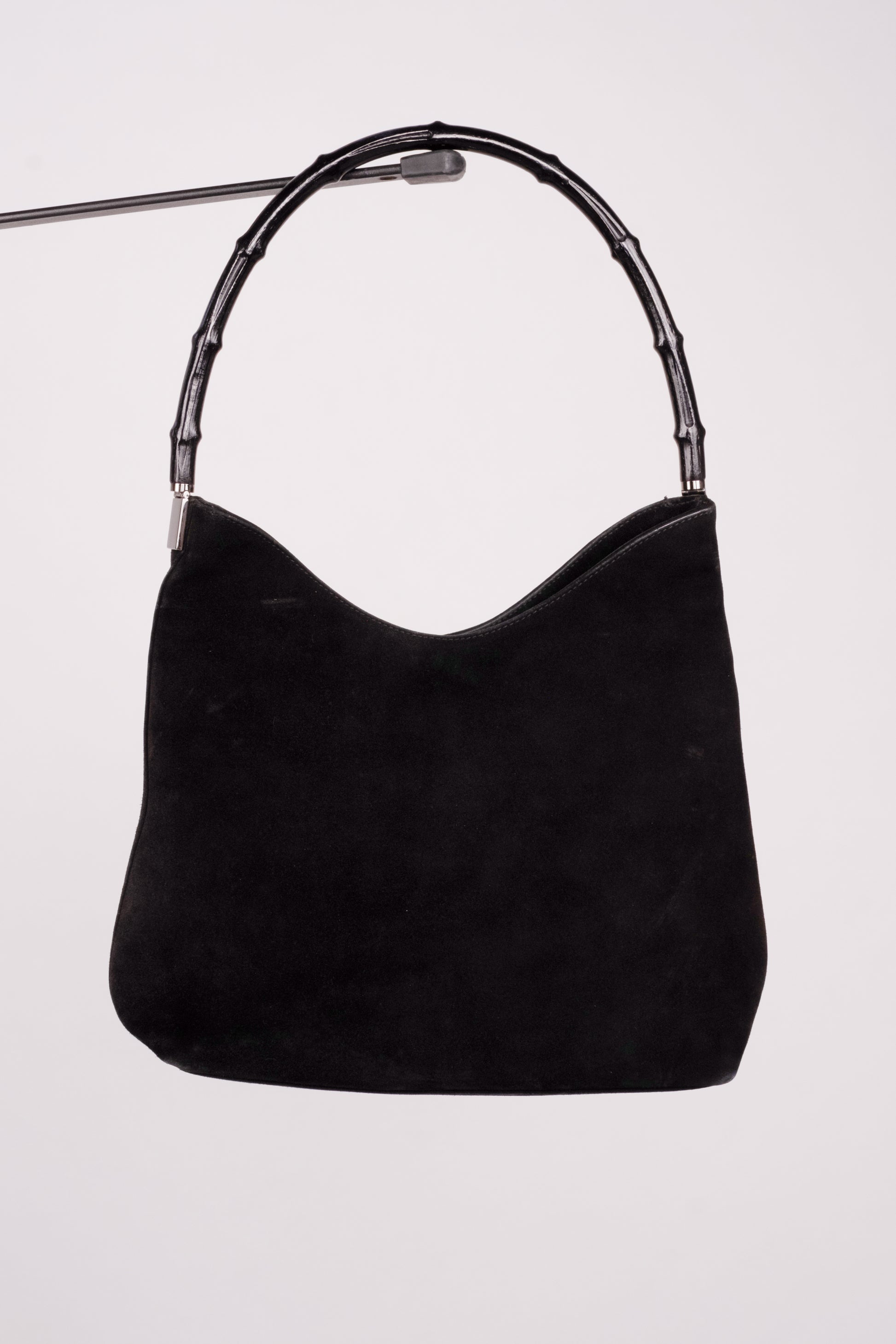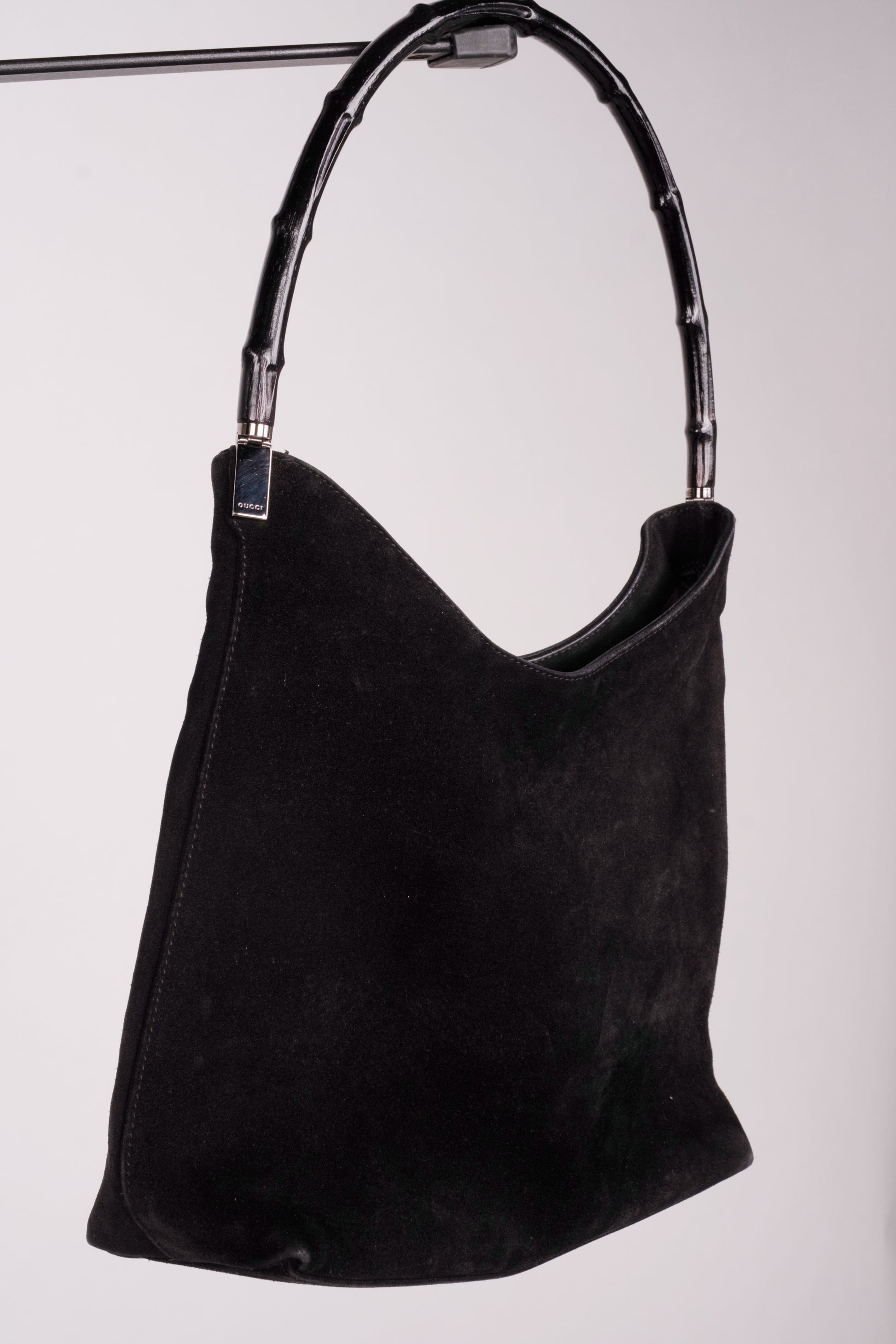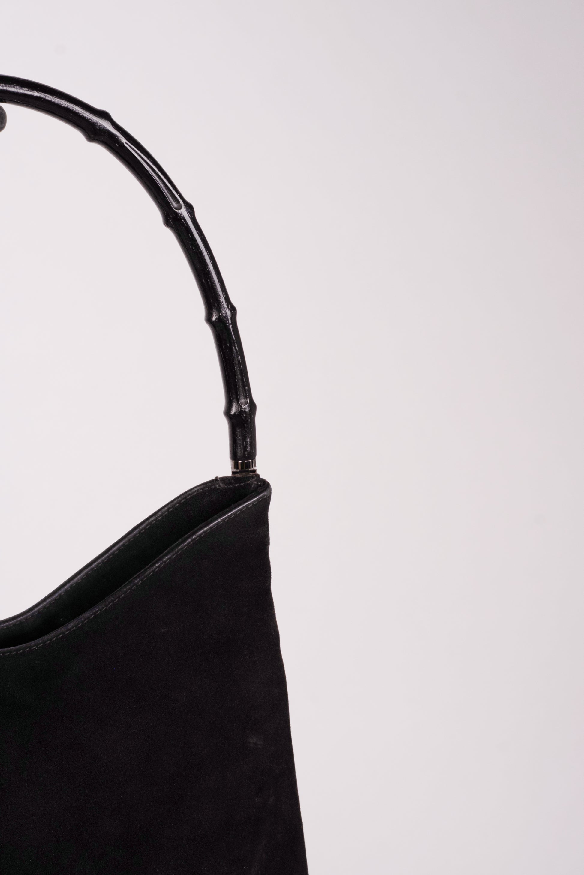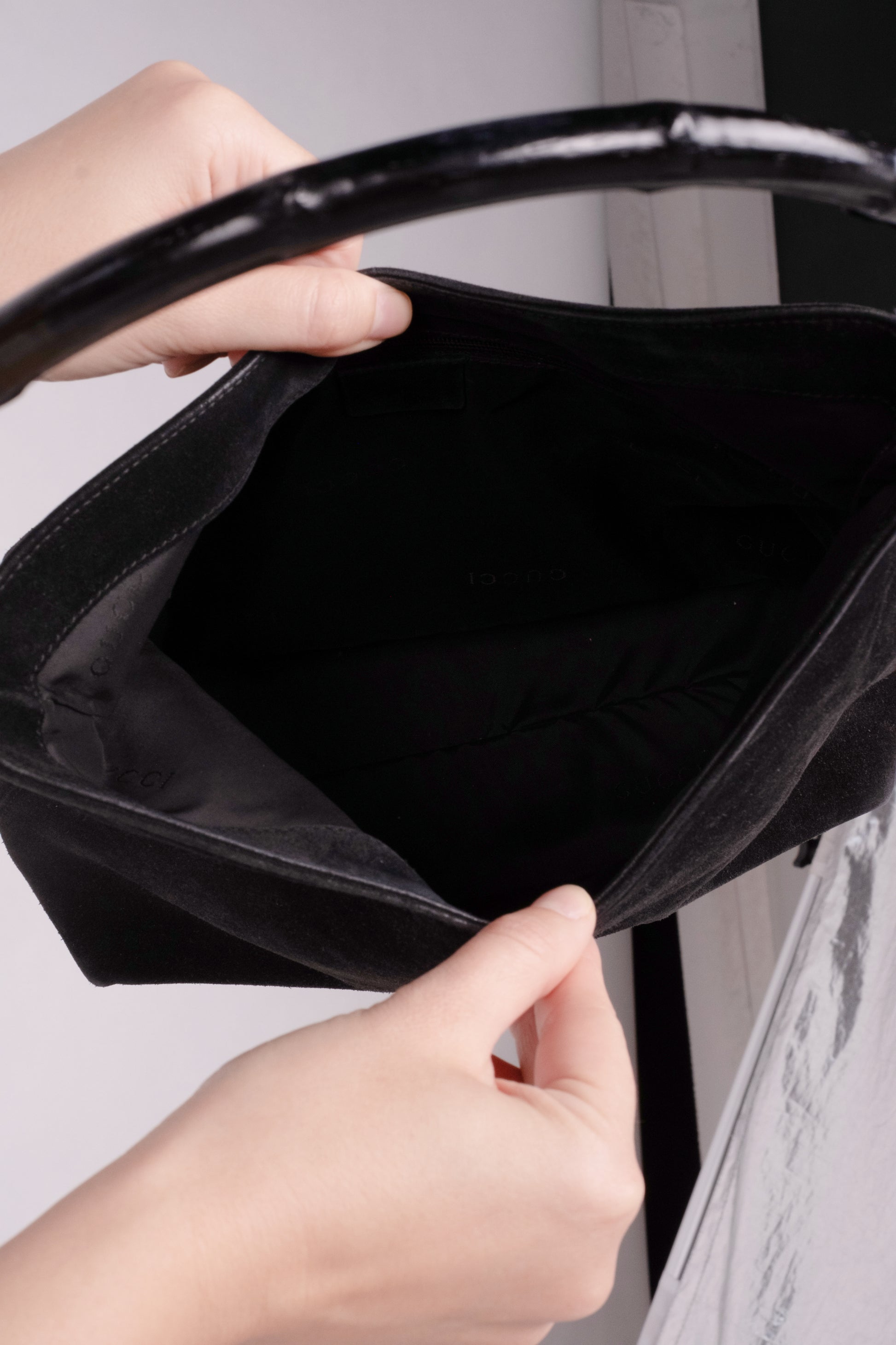 A vintage Gucci Bamboo bag from the 1990s, crafted from luxurious black suede leather with silver-tone hardware. The deep, velvety black hue is one that only suede can achieve — rich, tactile, and full of depth.