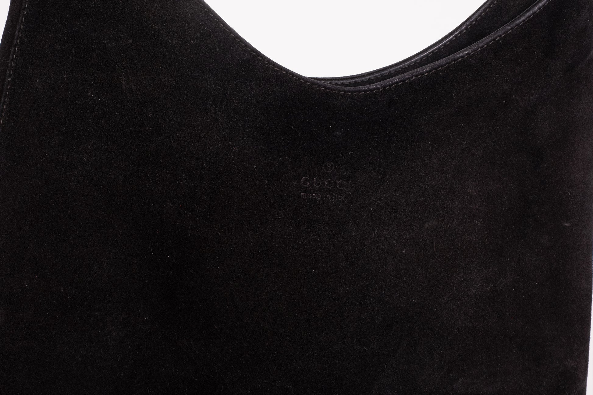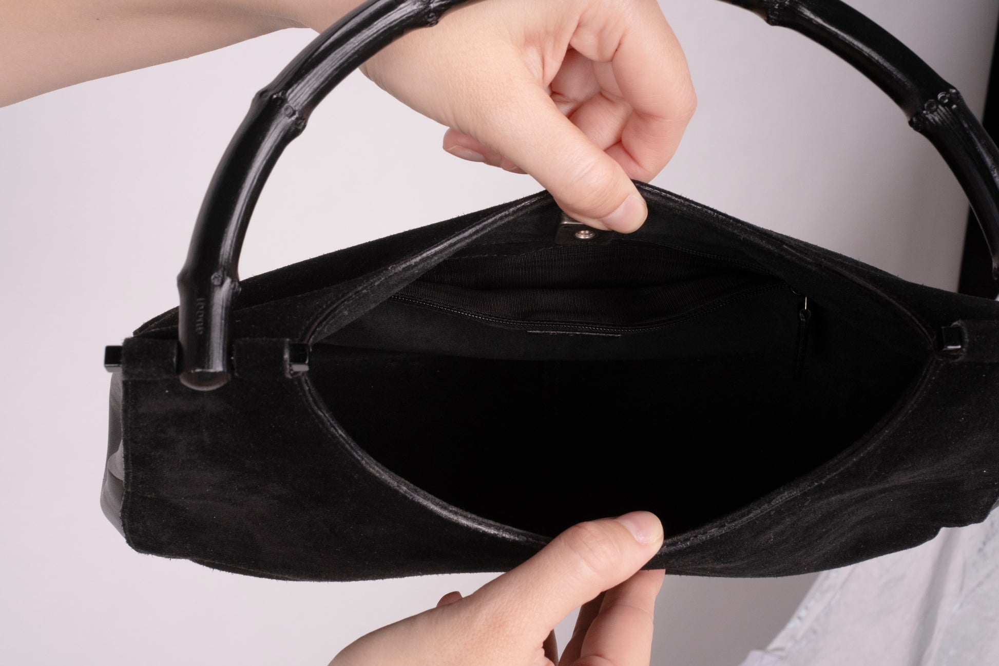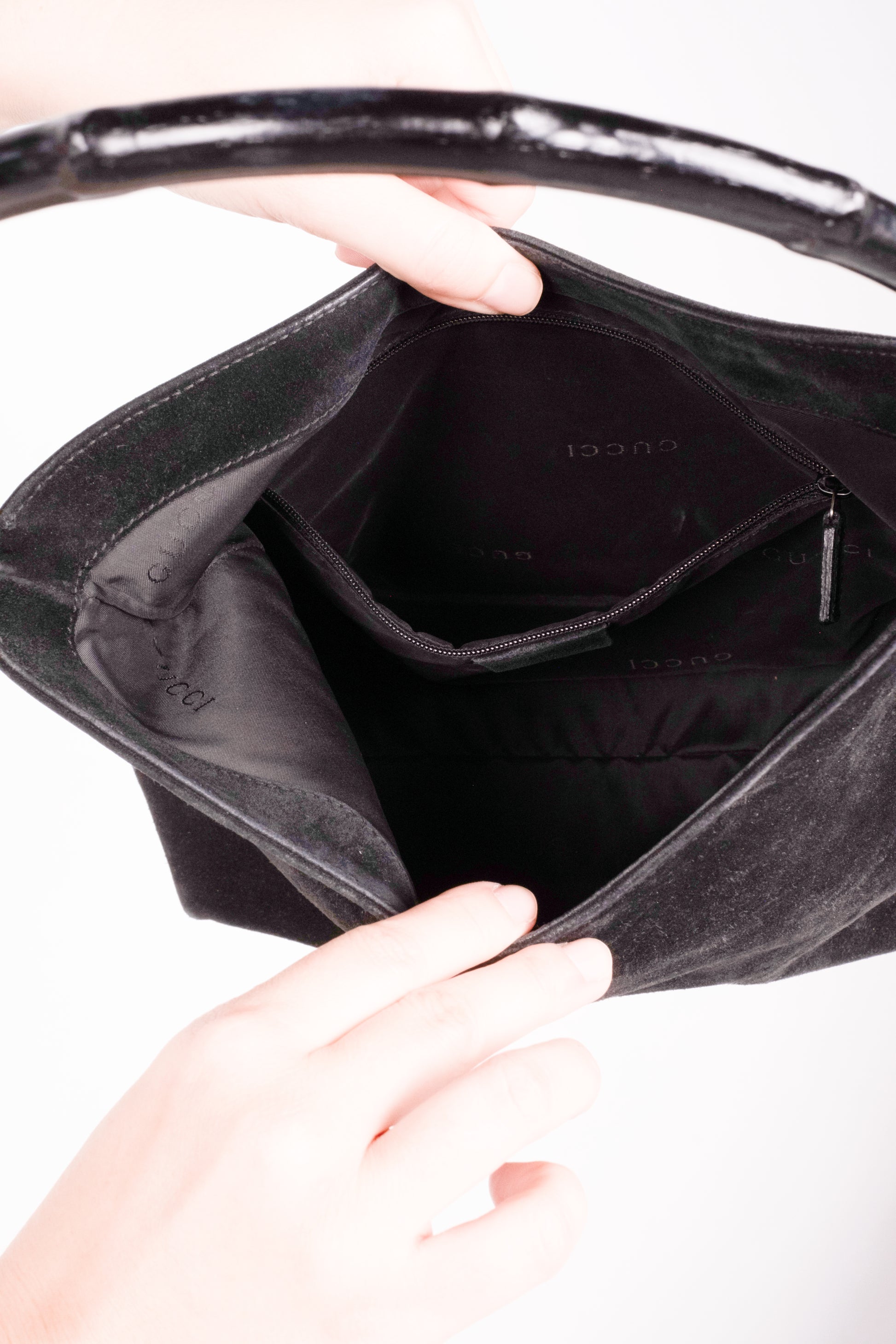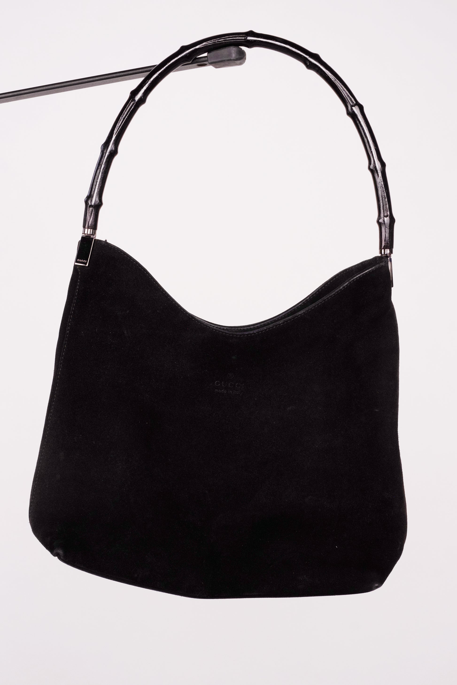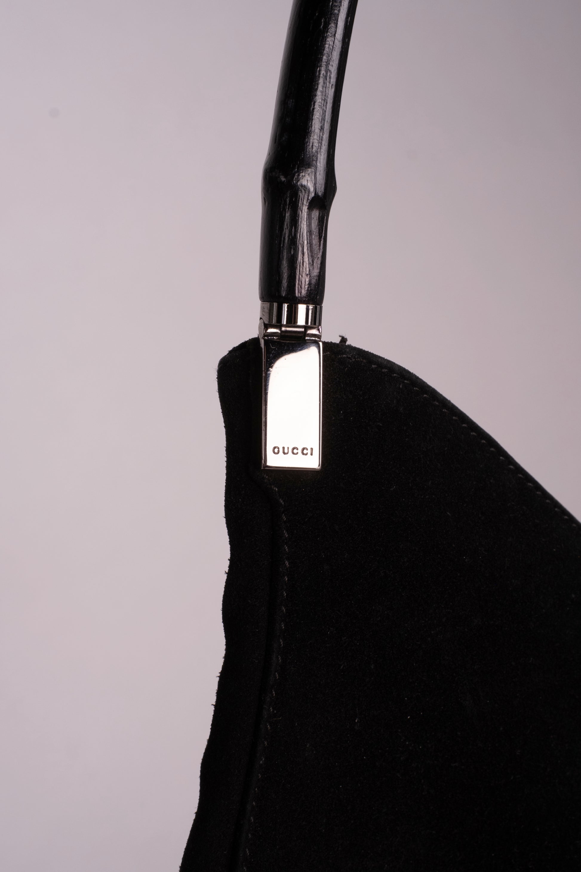 A vintage Gucci Bamboo bag from the 1990s, crafted from luxurious black suede leather with silver-tone hardware. The deep, velvety black hue is one that only suede can achieve — rich, tactile, and full of depth.